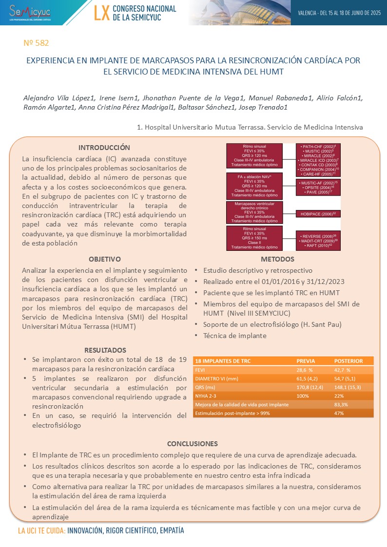 582. Experiencia en implante de marcapasos para la resincronización cardíaca por el servicio de medicina intensima del HUMT