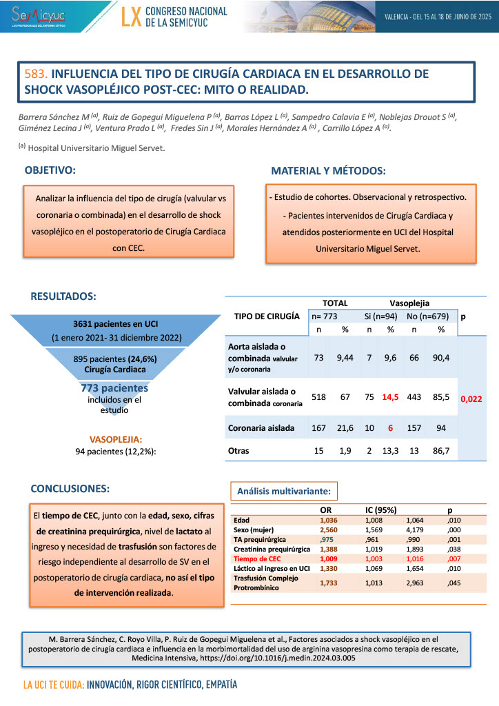 583. Influencia del tipo de cirugía cardíaca en el desarrollo de shock vasopléjico post-CEC: mito o realidad