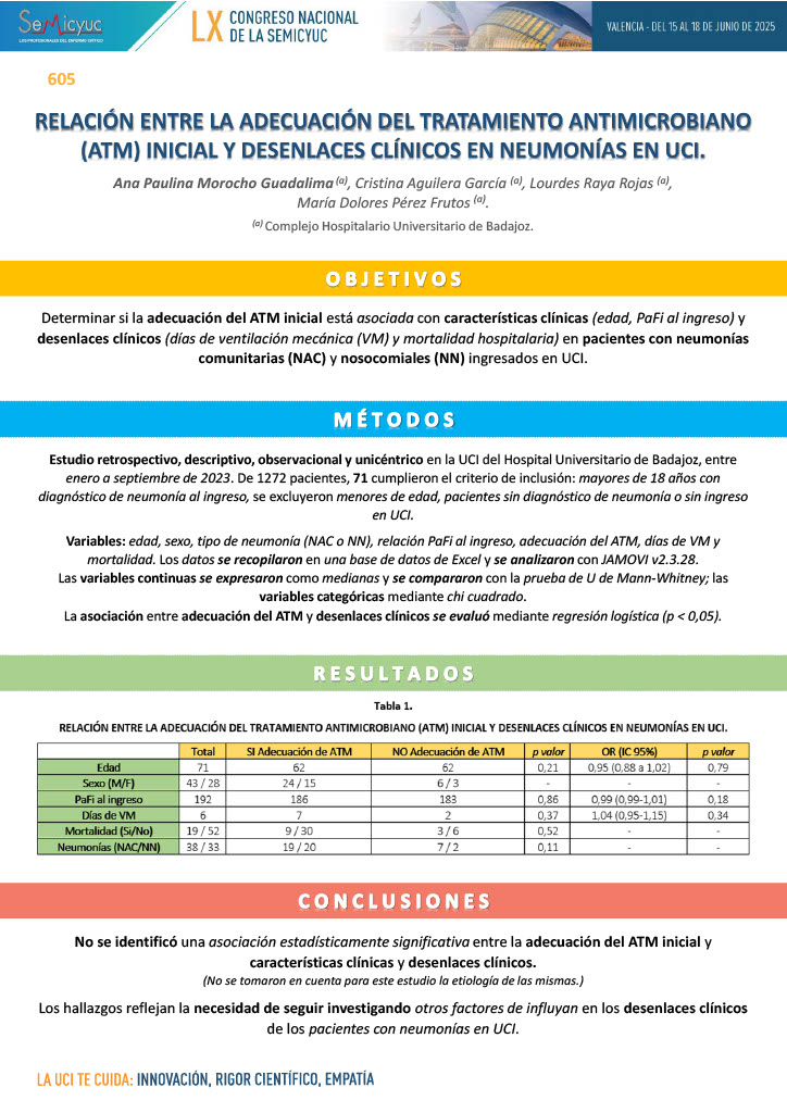 605. Relación entre la adecuación del tratamiento antimicrobiano (ATM) inicial y desenlaces clínicos en neumonías en UCI