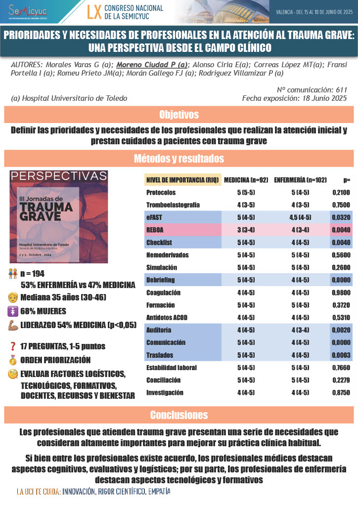 611. Prioridades y necesidades de los profesionales en la atención al trauma grave: una perspectiva desde el campo clínico