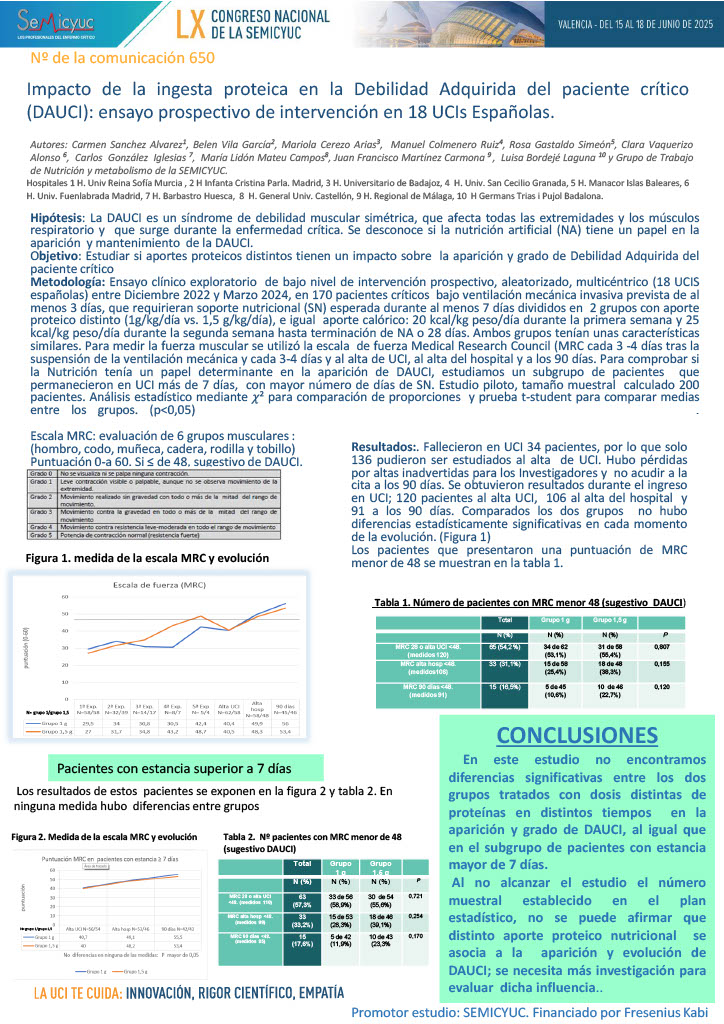 650. Impacto de la ingesta proteica en la debilidad del paciente crítico: ensayo prospectivo intervención en 18 UCIs Españolas