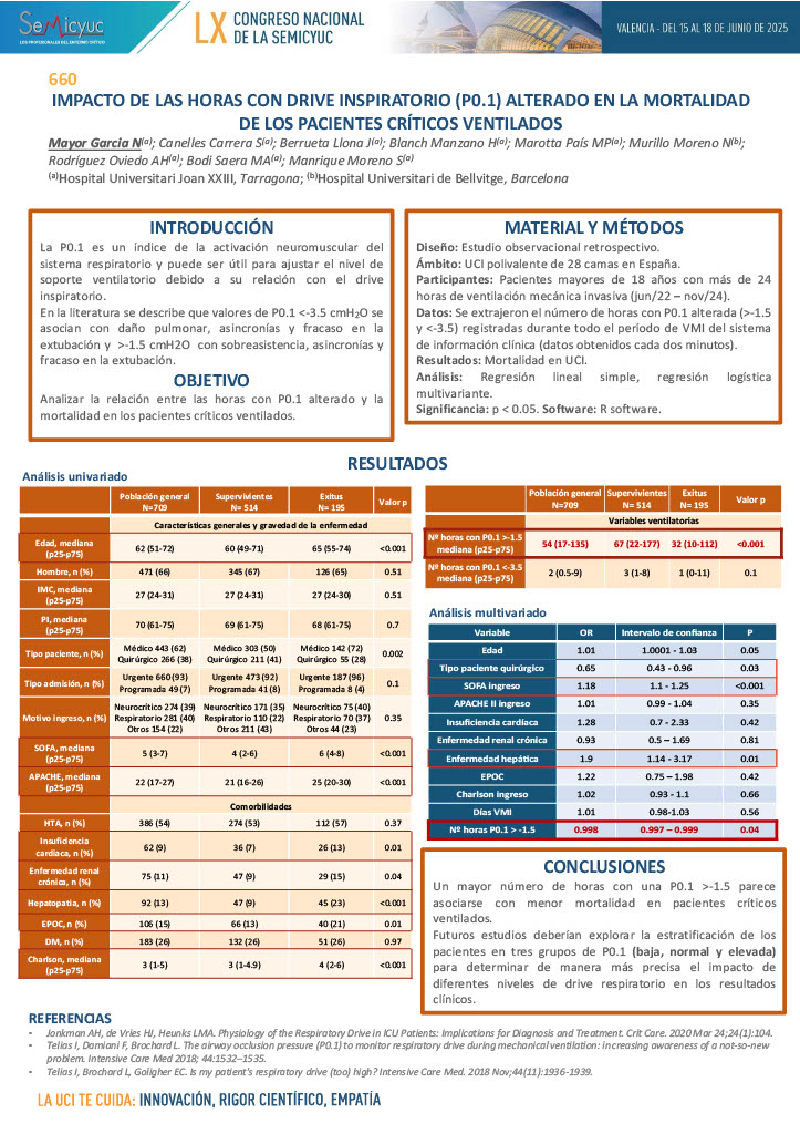 660. Impacto de las horas con drive inspiratorio (P0.1) alterado en la mortalidad de los pacientes críticos ventilados